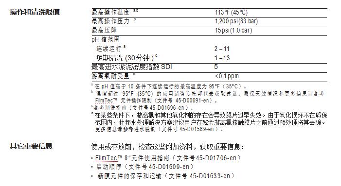 • 無需進行氧化后處理保證了在整個運行周期內都能保持高性能。FilmTec™ 元 件更耐用,且能在更寬泛的 pH 值范圍(1-13)內進行化學清洗。