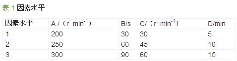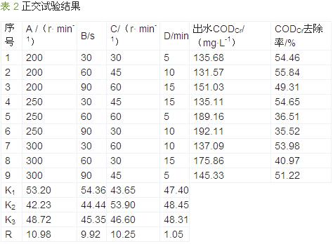 以 CODCr 去除率為考察指標,選取快速攪拌速度 (A )、 快 速 攪 拌 時 間 (B)、 慢 速 攪 拌 速 度 (C)、 慢速攪拌時間 (D) 為影響因素 ,進行四因素三水平的 L9(34)正交試驗。 因素水平的選取參考了前期單因素試驗的結果,各因素水平見表 1 ,試驗結果見表 2。