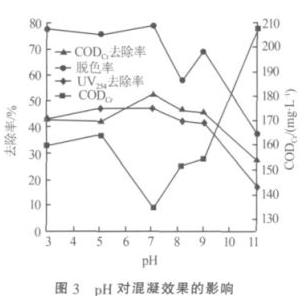 (1 ) 復 合 混 凝 劑 的 比較 佳 復 合 配 比 為 0.12 mL/L 雙氰胺脫色劑+87.5 mg/L PAC,在 pH=7 下同時投加 PAC 和雙氰胺脫色劑,以 200 r/min 快速攪拌 30 s,再以 45 r/min 慢速攪拌 10 min,沉淀 45 min,混凝處理后 CODCr 去除率、 脫色率 、UV254 去除率分別達到 57.70%、74.73%、36.50%。