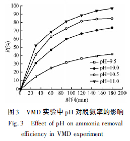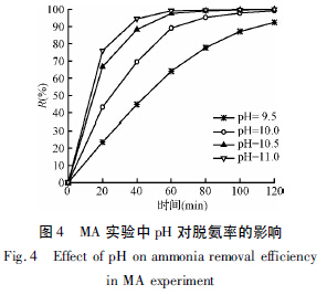 配制濃度為1 000 mg /L 的料液,控制兩側(cè)循環(huán)流速都為0. 10 m/s,料液進(jìn)口溫度40℃,稀硫酸吸收液進(jìn)口溫度20℃,濃度0. 02 mol /L,調(diào)節(jié)料液pH分別為9. 50、10. 0、10. 5 和11. 0 進(jìn)行MA 實驗,結(jié)果如圖4 所示。