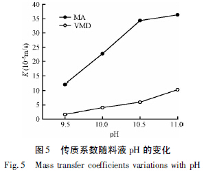 如圖5 所示,pH 值對VMD 和MA 實驗的傳質(zhì)系數(shù)影響很大,K 值先開始迅速提高后又趨于緩慢增加,隨著pH 由9.50 增大到11.0,2個膜過程的K值分別由1. 64 × 10-5 m/s、12.11 × 10-5 m/s 升高到了10.33 × 10-5 m/s、36.33 × 10-5 m/s,分別提高到初始K 值的6.3 倍和3.0 倍。這種現(xiàn)象可以通過NH3在水溶液中的電離平衡解釋,提高溶液的pH值,OH-濃度增大,平衡方程h2o向右移動,生成的氨氣越多,從而提高了膜兩側(cè)的蒸氣壓差,提高了傳質(zhì)動力,導(dǎo)致K 值增大。
