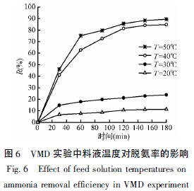 料液進(jìn)口溫度對VMD 脫氨實驗過程的影響很顯著,隨著溫度的增加,脫氨速度和效率明顯提高,當(dāng)溫度設(shè)置在20℃和30℃時脫氨效率較低。在料液進(jìn)口溫度達(dá)到40℃時,VMD 脫氨效率明顯提高,料液進(jìn)口溫度調(diào)節(jié)到50℃脫氨效率進(jìn)一步提高,但過高初始料液溫度會導(dǎo)致整個工藝能耗大大增加。