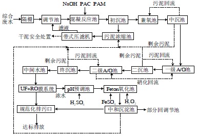 綜合廢水經(jīng)格柵井后進入調(diào)節(jié)池,經(jīng)調(diào)節(jié)池均質均量后泵入混凝反應池,在反應池中投加適量NaOH、PAC 和PAM 充分混凝反應后泥水流入初沉池進行分離,初沉池出水自流入兼氧- 兩級A/O 生化處理系統(tǒng),經(jīng)徹底的生物脫碳和硝化反硝化脫氮作用后生化處理出水匯入中間水池,中間水池廢水再經(jīng)泵提升入“UF+RO”膜分離系統(tǒng)進行深度處理,膜分離濃水經(jīng)Fenton 氧化池氧化分解較大部分殘留的有機污染物后再經(jīng)加堿中和沉淀處理,沉淀出水與膜分離淡水混合達標排放。具體工藝流程如圖1 所示。