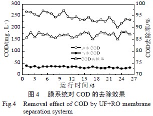 生化系統(tǒng)處理出水水質穩(wěn)定后接著進行“UF+RO”膜系統(tǒng)調(diào)試。先進行超濾前處理系統(tǒng)的調(diào)試,當出水穩(wěn)定達到超濾設計進水水質要求后按設計水量的60%左右啟動調(diào)試運行24 h 后再增至設計產(chǎn)水量運行;當超濾系統(tǒng)出水水質穩(wěn)定達到反滲透系統(tǒng)進水要求后啟動反滲透系統(tǒng)的調(diào)試運行。通過調(diào)試確定合理的操作壓力、清洗及藥洗的時間間隔,比較終保證膜處理系統(tǒng)符合設計要求。從調(diào)試運行結果來看,“UF+RO”膜系統(tǒng)對COD 具有高效的截留作用,其對COD 的去除效果如圖4 所示。