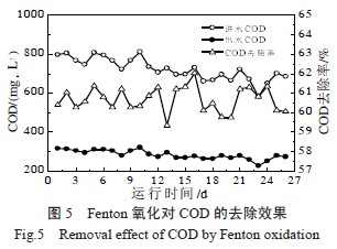 對反滲透濃水先進行Fenton 氧化試驗小試,試驗方法采用以H2O2(30%)投加量、FeSO4 投加量、pH、反應時間為變量的4 因素3 水平正交試驗和比較佳水平組合試驗,結果表明,各因素對COD 去除的影響順序:H2O2投加量>PH>反應時間>FeSO4投加量;比較佳工藝控制條件:pH=3,H2O2 投加量2mL/L,F(xiàn)eSO4 投加量300 mg/L,反應時間3 h。按照試驗確定的pH 及投藥量進行Fenton 氧化及中和沉淀段的調(diào)試運行,實際Fenton 反應水力停留時間6 h左右,結果表明對COD 的去除率可達59%~62%,具體對COD 的去除效果見圖5。