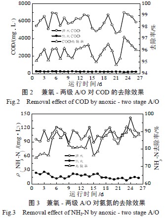工藝調(diào)試于2012 年3 月份開始,先對兼氧和一級A/O 系統(tǒng)進行接種污泥啟動培菌馴化,初始進水COD 負荷控制在0.6 kg/(m3·d),并投加面粉、廢甲醇等營養(yǎng)物質,培養(yǎng)7~10 d 后逐步提高進水負荷,至進水負荷達到設計負荷的50%時啟動二級A/O 系統(tǒng)調(diào)試,二級A/O 系統(tǒng)接種污泥來自一級A/O 系統(tǒng)活性污泥。歷經(jīng)4 個多月時間,通過控制穩(wěn)定的進水、調(diào)整系統(tǒng)的曝氣量、硝化液回流比、污泥齡等手段使系統(tǒng)處理能力穩(wěn)步提升直至到達設計處理能力并維持穩(wěn)定的運行狀態(tài)。從滿負荷穩(wěn)定運行以來的日常水質檢測情況來看,在進水平均COD 為5 995mg/L、平均NH3-N 質量濃度為107 mg/L,生化處理系統(tǒng)出水平均COD 為243 mg/L,平均COD 去除率為95.9%;出水平均NH3-N 質量濃度為16.5 mg/L,平均NH3-N 去除率為84.3%。兼氧- 兩級A/O 系統(tǒng)對COD 和NH3-N 的去除效果見圖2 和圖3。
