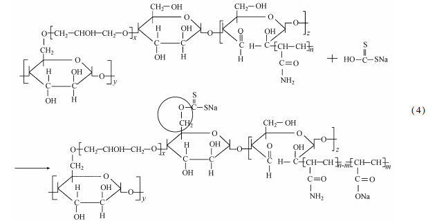 采用交聯淀粉為母體,在酸性條件下以硝酸鈰銨為引發劑,以丙烯酰胺為單體,合成交聯淀粉-聚丙烯酰胺接枝共聚物(CSA);又在堿性條件下,使該接枝共聚物與二硫化碳作用,生成交聯淀粉-聚丙烯酰胺-黃原酸酯(CSAX).由于其結構中同時存在重金屬離子的強配位基黃原酸基和具有絮凝功能的聚丙烯酰胺側鏈,因而可同時捕集重金屬離子和去除濁度.其中CSA與二硫化碳的反應可以用式(3)~式(4)表達.
