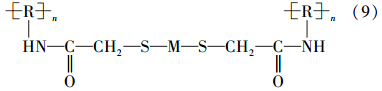 PEX捕集重金屬離子的主要作用機理包括了重金屬離子與PEX分子鏈上的二硫代羧基的配位或螯合作用及與PEX分子鏈上的胺基的配位作用,其中與二硫代羧基的螯合作用發揮主要的捕集功能,它可以是重金屬離子與同一分子鏈上的兩個以上相鄰配位基之間的螯合,也可以是重金屬離子與分屬于多個分子鏈上配位基之間的螯合,以后者為例,表示如下:
