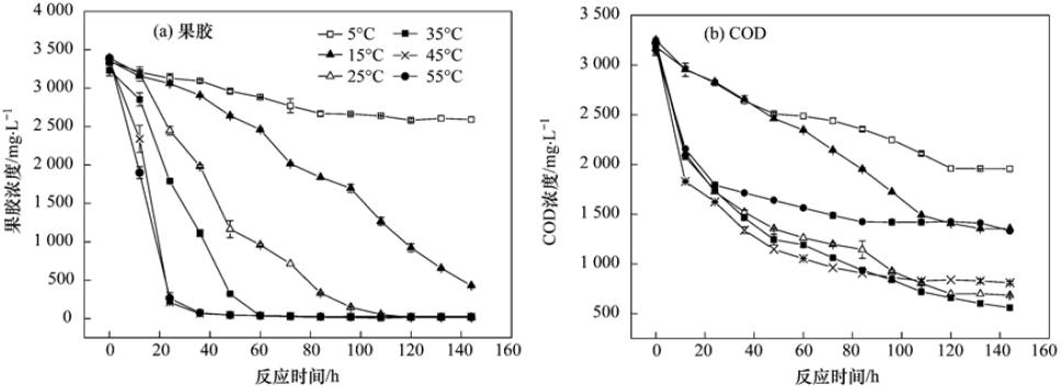 (3)溫度越高,降解果膠所需的時間越短. 5℃時,降解144 h后,出水果膠濃度為2?589.6 mg ·L-1,而溫度為55℃時僅需36 h,出水果膠濃度可在80 mg ·L-1以下. 隨著溫度在5~35℃范圍內變化,厭氧污泥對果膠廢水中COD的去除率從38.6%逐漸增加到91.5%,當溫度高于35℃時,厭氧污泥對果膠廢水中COD的去除率逐漸降低.
