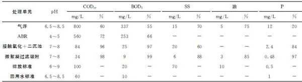 本工程采用氣浮-ABR-接觸氧化-過(guò)濾吸附組合工藝,取得良好的處理效果。由各處理單元出水2010年月平均值可知,本工藝的平均CODcr去除率為98%,SS去除率為88%,油去除率為85%,運(yùn)行過(guò)程中主要處理單元的出水水質(zhì)見(jiàn)表3。