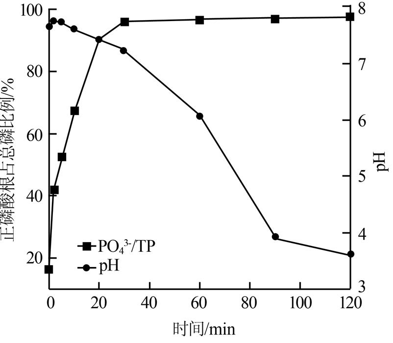 實驗水質同2.2,考察臭氧投加質量濃度為96 mg/L時,廢水中正磷酸鹽占總磷比例和pH隨時間的變化趨勢,結果如圖 3所示。