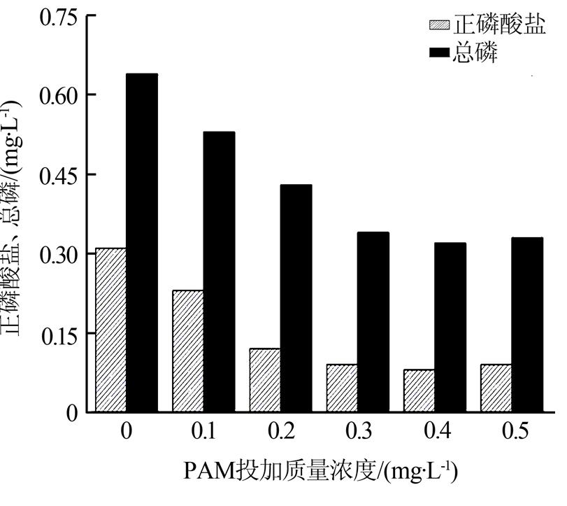 從圖 5可以看出,當PAM投加質量濃度為0.3 mg/L,經沉淀后總磷質量濃度可降低至0.4 mg/L以下,正磷酸鹽質量濃度降低至0.1 mg/L以下。當PAM投加質量濃度大于0.3 mg/L,總磷和正磷酸鹽濃度變化趨勢不明顯。從實驗現象可以看出,與不加PAM相比,加入PAM后形成的絮體體積更大,沉淀時間減少。但是,過多加入PAM,不僅會增加廢水處理藥劑費用,同時還會增加水體COD〔11〕。因此,實驗確定PAM的比較佳投加質量濃度為0.3 mg/L。