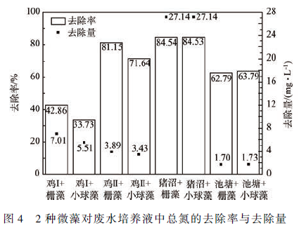 由圖5 可知,柵藻+ 雞Ⅰ組和柵藻+ 雞Ⅱ組以及小球藻+ 雞Ⅱ組中亞硝氮的去除率均在90% 以上。此外,小球藻對雞Ⅰ和池塘培養液中亞硝氮的去除率也在80% 以上。計算得各組亞硝氮減少總量:豬沼和池塘組> 雞Ⅰ和雞Ⅱ組。亞硝氮初始濃度較高的溶液中,2 種微藻對其吸收量多。而初始濃度較低的組,吸收利用率高。