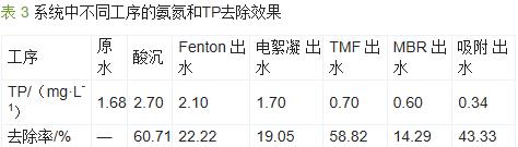 由表3可見,工藝中對TP去除起主要作用的工序是TMF過濾,其去除率約為58%。經過MBR和吸附處理后,廢水中TP質量濃度小于0.5mg/L,達到(GB21900—2008)表3標準的要求。
