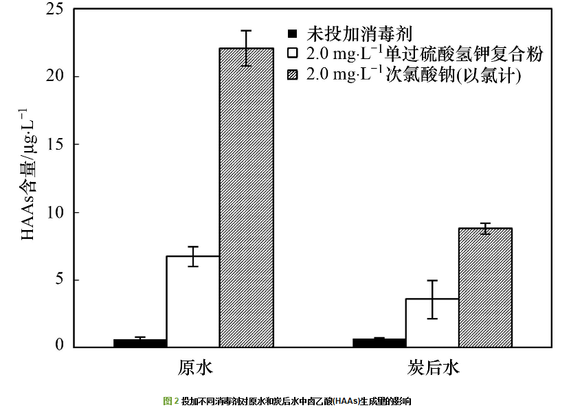 由圖 1和圖 2可以看出,原水和炭后水投加兩種消毒劑后,水中有機物與兩種消毒劑均發生反應生成了DBPs,其中THMs和HAAs含量相對原水和炭后水有明顯上升. 原水的THMs和HAAs含量分別為1.41 μg·L-1和0.59 μg·L-1,投加2.0 mg·L-1單過硫酸氫鉀復合粉后THMs和HAAs含量提高至8.98 μg·L-1和6.72 μg·L-1,相應地投加次氯酸鈉后二者含量增至18.54 μg·L-1和22.06 μg·L-1. 對于炭后水而言,也取得了相似的試驗結果.