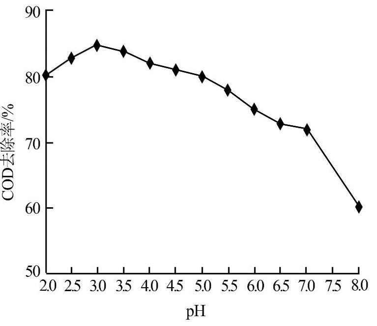 由圖4可以看出,在酸性條件下,隨pH的增加,廢水COD去除率增加,在pH=3.0時有比較佳效果。當pH小于3.0時,鐵屑與酸反應生成的氫氣大量覆蓋在鐵屑的表面,減小了鐵屑的有效表面積,降低了原電池效應,從而使處理效果下降。而且溶液pH過低,會破壞絮凝體,使溶液因Fe2++和Fe3++濃度增大而色度增加。當pH大于3.0時,H+濃度逐漸降低,陰極的反應效果也下降。所以選擇適宜的進水pH為3.0。
