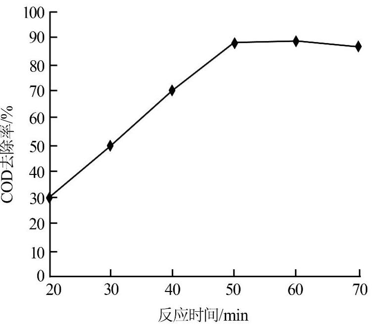 由圖5可知,隨反應時間的增加,COD去除率不斷增加。在反應進行到50 min時,COD去除率比較高,達到88%。超過50 min后COD去除率基本不再變化,甚至有所降低。其原因是,反應時間延長可使電極反應的產物與廢水中污染物進行充分的電化學、吸附及絮凝等作用。但是反應時間過長會使更多的Fe2++被氧化成Fe3++,使色度增加,反應時間過長也會導致廢水中沉積物沉積在填料之間的空隙中,覆蓋于鐵和炭表面,阻礙了兩者的接觸,抑制反應的進行。而且反應時間的延長,會使反應器的容積增加、建筑面積增加,基建費用和設備投資費用增加。因此將比較佳反應時間定為50 min。