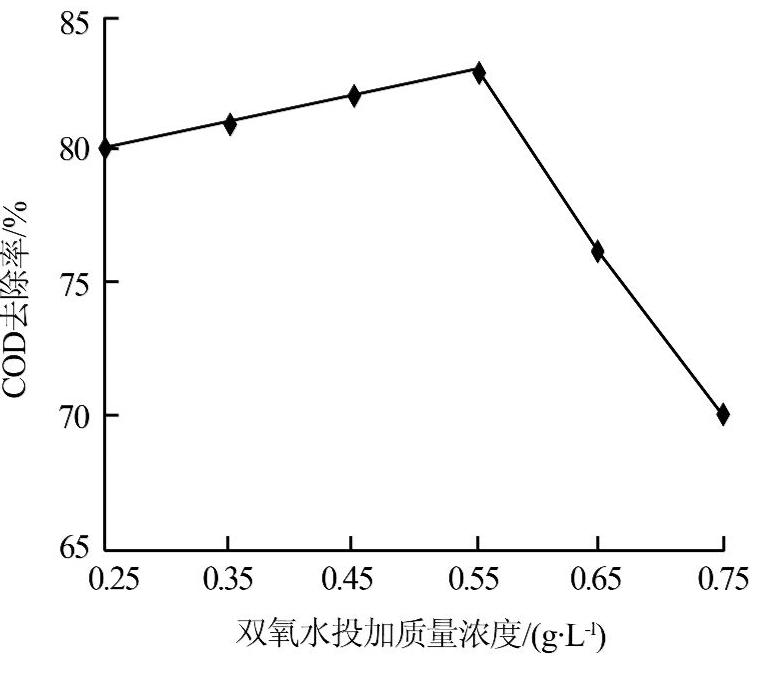 在pH=3.0,鐵炭總質量濃度20 g/L,反應時間40 min,MnO2投加質量濃度為2.50 g/L,鐵炭比3∶1條件下,分別加入0.25、0.35、0.45、0.55、0.65、0.75 g/L H2O2進行實驗,考察H2O2對微電解處理廢水體系的催化作用,結果如圖3所示。