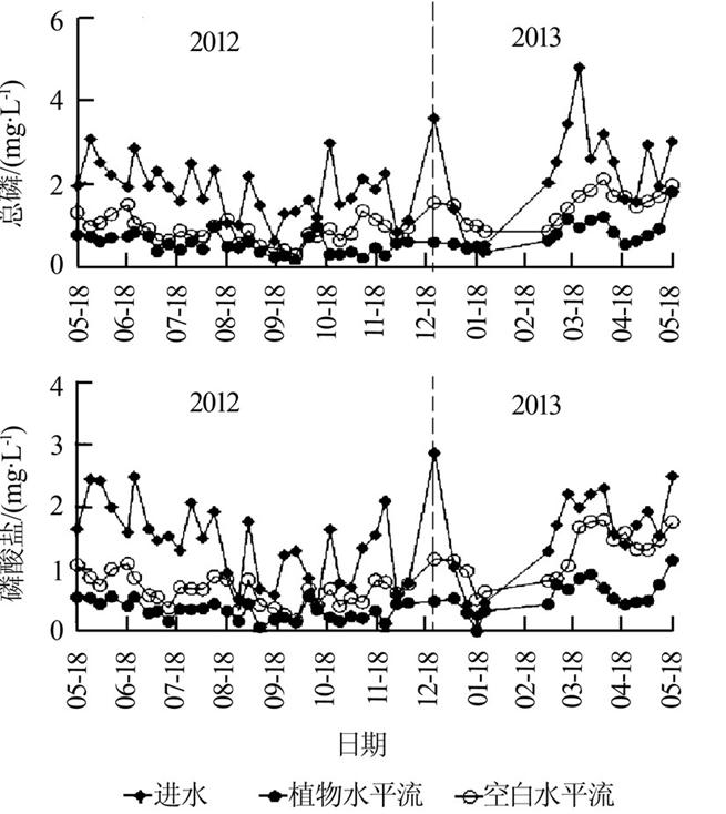 1號和2號濕地出水中的TP、PO43--P分別為(0.6±0.04)、(0.4±0.03) mg/L和(1.1±0.06)、(0.9±0.06) mg/L〔p(TP)=0.004,p(PO43--P)=0.000〕,說明與脫氮相比,植物對濕地除磷的影響更為明顯且差異性更為顯著,種植植物的水平潛流濕地對磷的去除效果更好且更加穩定。這表明植物在水平潛流濕地中不僅對磷進行直接吸收,還優化了濕地對磷吸附去除的條件〔11〕。與脫氮不同的是水平潛流濕地對磷去除率的下降發生在春季,可能是這段時間濕地中藻類生長造成的。