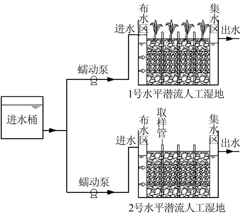 于西安建筑科技大學校內構建2組結構相同的由有機玻璃構成的水平潛流人工濕地(尺寸均為0.75 m×0.4 m×0.8 m)。為了獲得較好的水力性能和處理效果,實驗采用了不同粒徑的填料組成,其礫石粒徑配比從下到上為15 cm大粒徑(d:15~30 mm)、25 cm小粒徑(d:5~15 mm)、15 cm大粒徑(d:15~30 mm),基質孔隙率為50%。1號濕地為種植蘆葦的水平潛流濕地,種植密度為13株/m2,2號濕地為未種植植物的空白水平潛流濕地。礫石、蘆葦均取自西安皂河附近。
