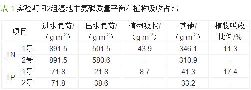 秋季對1號濕地中的植物進行收割,通過測量植物干重和植物內的氮磷含量,得到實驗期間通過植物吸收所去除的營養物總量,并與2號濕地進行對比,結果如表 1所示。