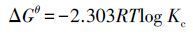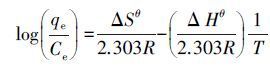 式(7)中,Kc為溫度T下的平衡常數(shù),可以通過(guò)Kc=qe/Ce計(jì)算,qe為平衡吸附容量,Ce為溶液中吸附質(zhì)的平衡濃度,ΔGθ、ΔHθ和ΔSθ分別為標(biāo)準(zhǔn)狀態(tài)下吸附反應(yīng)的吉布斯自由能變、焓變和熵變.公式(7)也可以表示為: