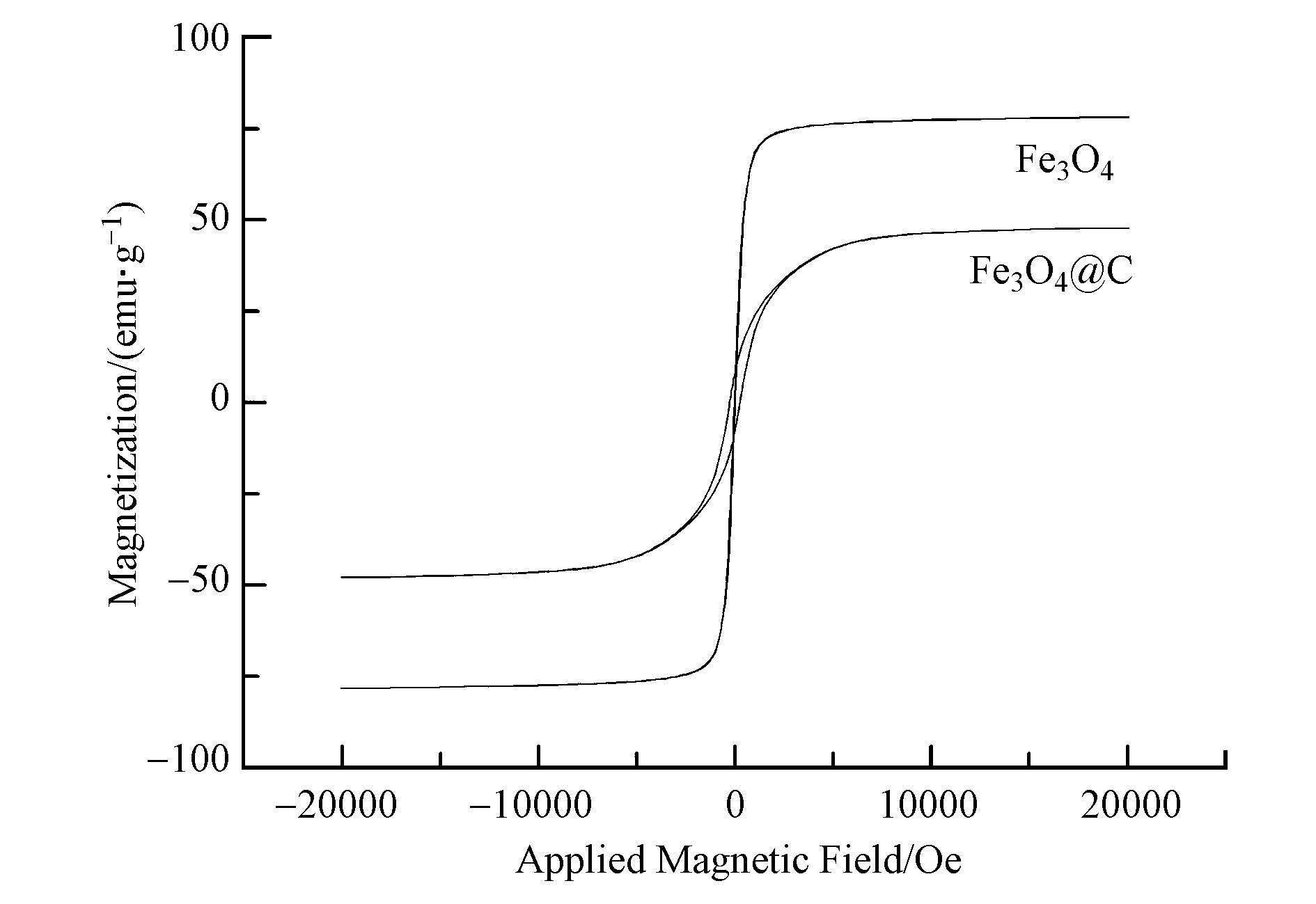 圖 2給出了Fe3O4、Fe3O4@C的磁滯回線.Fe3O4沒(méi)有磁滯現(xiàn)象,矯頑磁性和剩磁基本為零,表現(xiàn)出順磁性的特性,而Fe3O4@C出現(xiàn)了明顯的磁滯現(xiàn)象,剩磁為7.86,矯頑力為251,顯示出少量鐵磁性,這可能是由于在聚合多巴胺炭化的過(guò)程中部分Fe3O4在高溫條件下相變?yōu)镕e2O3.Fe3O4和Fe3O4@C的比較大飽和磁強(qiáng)度分別為78.7 emu·g-1和47.2 emu·g-1.Fe3O4@C磁性降低是因?yàn)橐肓藷o(wú)磁性的殼層.材料吸附了污染物后,利用磁鐵很容易從溶液中分離出來(lái).