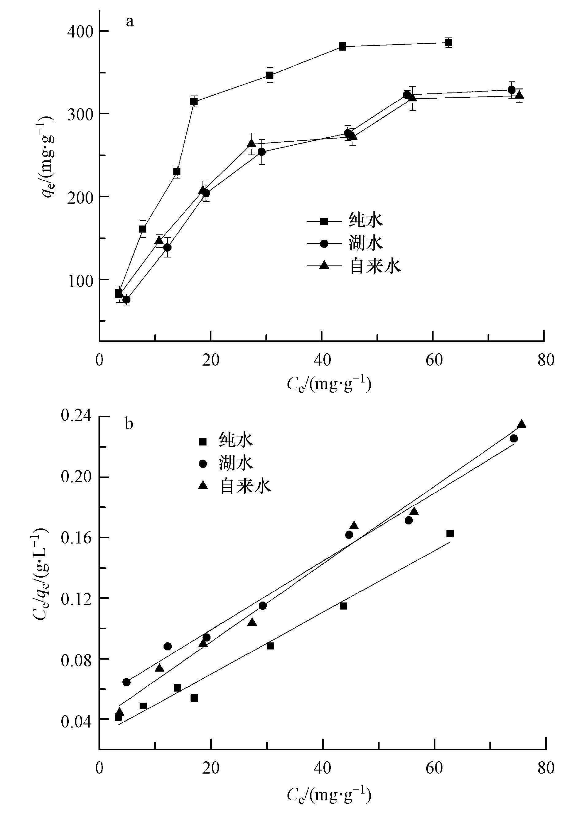 等溫吸附研究在30 ℃下進(jìn)行,甲基綠初始濃度設(shè)置為20、40、60、80、100、120、140 mg·L-1,為考察吸附劑對(duì)不同水樣中甲基綠的吸附效果,選擇純水、湖水和自來(lái)水作為介質(zhì),吸附數(shù)據(jù)如圖 7a.隨著各水樣中甲基綠濃度的上升,吸附容量在開(kāi)始時(shí)急劇上升,隨后就趨于平緩,說(shuō)明吸附達(dá)到了飽和.采用朗格繆爾和弗倫德里希兩種模型對(duì)吸附數(shù)據(jù)進(jìn)行擬合,兩種模型線性方程如(1)、(2)所示.