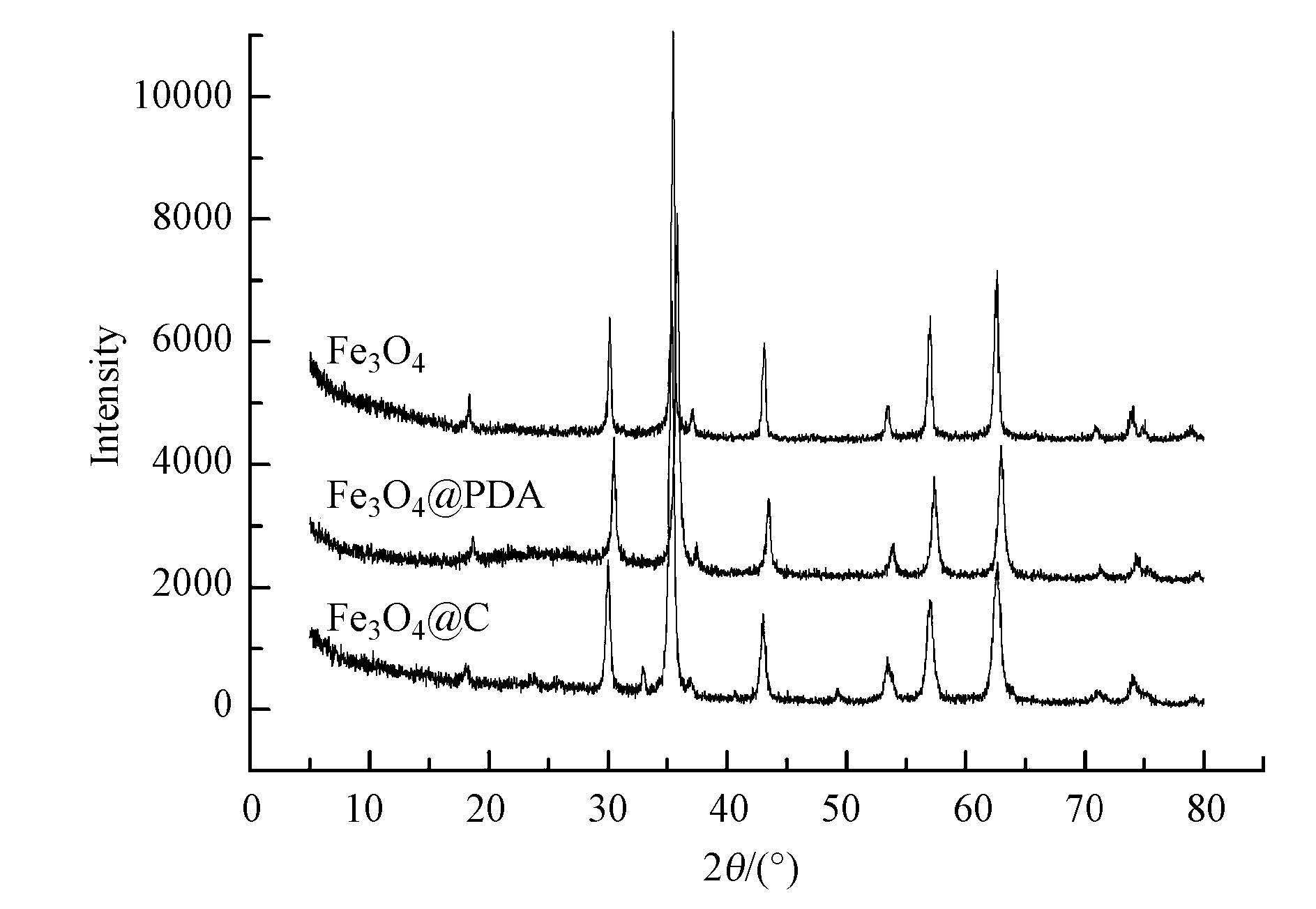 圖 3給出了Fe3O4、聚多巴胺包覆的Fe3O4@PDA、Fe3O4@C的X射線衍射圖.Fe3O4和Fe3O4@PDA衍射峰的位置完全一樣,在2θ為30.12°、35.38°、43.05°、53.39°、56.91°、62.54°處出現(xiàn)了較強(qiáng)的衍射峰,其分別對(duì)應(yīng)立方相Fe3O4的(220)、(311)、(400)、(422)、(511)、(440)晶面(張燚等,2011;危晶等,2012;黃保軍等,2012),經(jīng)過(guò)在高溫下炭化得到的Fe3O4@C除在以上位置有衍射峰外,在2θ為33.17°和49.33°處有較小的衍射峰,對(duì)應(yīng)著斜六方Fe2O3的(104)和(024)晶面,這說(shuō)明在炭化的過(guò)程中部分Fe3O4相變?yōu)镕e2O3,與磁性測(cè)量的結(jié)果一致.