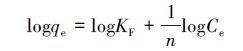 式中,qe和Ce 分別為平衡吸附容量(mg·g-1)和平衡濃度(mg·L-1);θ為比較大吸附容量,b為平衡吸附常數(shù).比較大吸附容量θ可以通過(guò)Ce /qe對(duì)Ce斜率的線形 圖計(jì)算.KF(mL1/n μg1-1/n)和n是Freundlich常數(shù).n和KF的值是通過(guò)logqe對(duì)logCe的線性擬合的截距求出.圖 7b是吸附數(shù)據(jù)的Langmuir線性擬合.