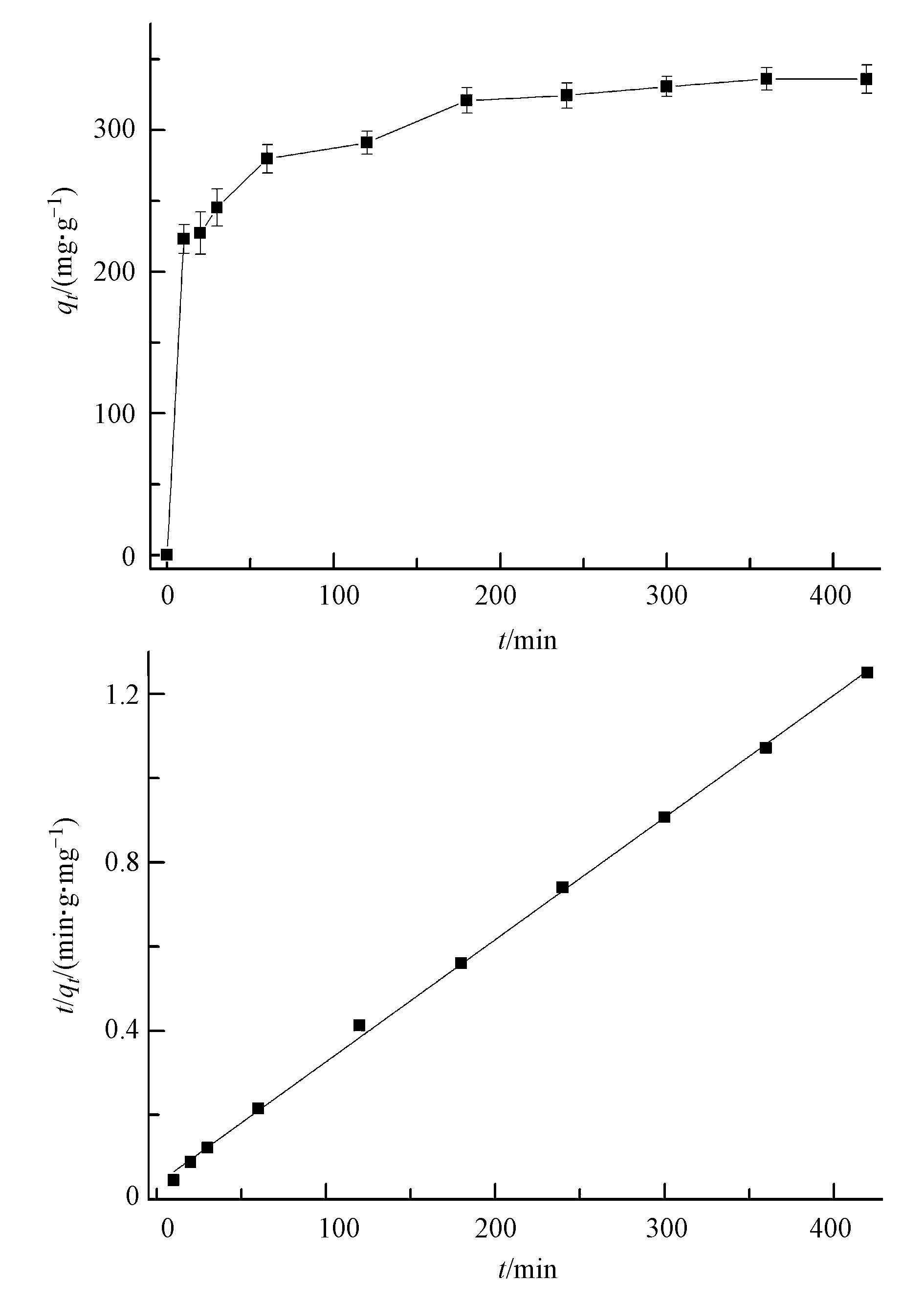 圖 8甲基綠在Fe3O4@C上(a)吸附量隨時(shí)間的變化及(b)擬二級(jí)動(dòng)力學(xué)擬合曲線