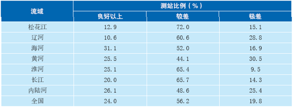 以地下水含水系統(tǒng)為單元,潛水為主的淺層地下水和承壓水為主的中深層地下水為對(duì)象的6124個(gè)地下水水質(zhì)監(jiān)測(cè)點(diǎn)中,水質(zhì)為優(yōu)良級(jí)、良好級(jí)、較好級(jí)、較差級(jí)和極差級(jí)的監(jiān)測(cè)點(diǎn)分別占10.1%、25.4%、4.4%、45.4%和14.7%。目前,海河、遼河、黃河、淮河、松花江五大重點(diǎn)流域均處超標(biāo)狀態(tài)。