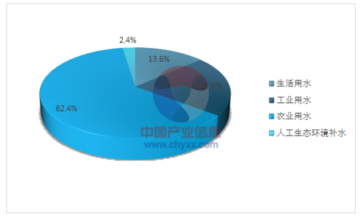 資料來(lái)源:智研咨詢整理、水利部水資源的需求幾乎涉及到國(guó)民經(jīng)濟(jì)的方方面面,如工業(yè)、農(nóng)業(yè)、建筑業(yè)、居民生活等,嚴(yán)重的缺水問(wèn)題導(dǎo)致我國(guó)城鎮(zhèn)現(xiàn)代化建設(shè)進(jìn)程、GDP 的增長(zhǎng)和居民生活水平的提高都受到了限制。2016年全國(guó)總用水量6040.2億m3。其中,生活用水占總用水量的13.6%;工業(yè)用水占21.6%;農(nóng)業(yè)用水占62.4%;人工生態(tài)環(huán)境補(bǔ)水(僅包括人為措施供給的城鎮(zhèn)環(huán)境用水和部分河湖、濕地補(bǔ)水)占2.4%。2016年我國(guó)水資源的具體用水比例情況