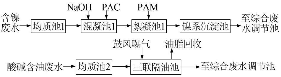 對封孔含鎳廢水的處理主要是利用混凝化學法去除廢水中大部分的二價鎳離子,出水進入后續綜合廢水調節池。對酸堿含油廢水,由于該廢水中的油脂多與表面活性劑等混雜在一起,其相對密度小于1,在靜態下可浮于水面上,因此,首先通過隔油池將廢水中大部分的油脂類物質除去后,再進行后續的深度處理。