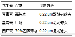 配制濃度為800 mg · L-1的青霉素、氯霉素和四環素儲備液,并進行過膜除菌,具體配制方法見表 1. 將抗生素儲備液避光保存于-20 ℃冰箱內,保存時間不超過1周.