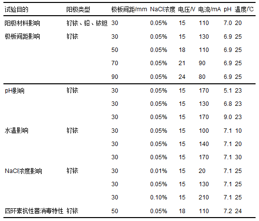 為探究裝置參數對消毒效果的影響,在連續流條件下,分別改變陽極極板材料和極板間距,在相同消毒條件下考察電化學裝置對大腸桿菌CGMCC 1.3373的滅活效果.一般采用對數去除率,即消毒后微生物存活率倒數的對數值(以10為底)表示滅活效果,如對數去除率2對應的滅活率為99%.在確定比較佳裝置參數后,進一步考察pH、水溫和NaCl濃度等水質條件對大腸桿菌CGMCC 1.3373電化學消毒特性的影響.比較后,考察電化學裝置對四環素抗性菌CGMCC 1.1595的滅活效果及對其抗性的影響.具體試驗條件如表 2所示.