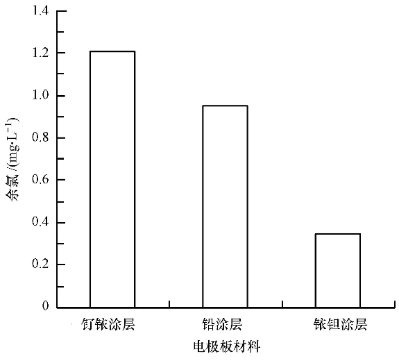 3種不同陽極電極板對普通大腸桿菌的電化學滅活效果如圖 1所示,在實驗過程中調整電極板之間的電壓和電流,保證在相同的電功率下進行消毒.由圖 1可以看出,釕銥涂層鈦電極板的效果明顯好于鉛涂層和銥鉭涂層鈦電極板,因此,在后續的試驗中采用釕銥涂層鈦電極板作為反應器的極板.電化學消毒機理包括電場直接作用滅菌、電解產生自由氯滅菌和電解產生羥基自由基等強氧化性物質滅菌等.研究發現,電解產氯對消毒效果的貢獻較大.為了探究不同陽極板消毒效果的差異,進一步測定不同電極板在消毒20 s時產生的余氯量,結果如圖 2所示.由圖 2可知,釕銥涂層鈦電極板在消毒20 s后產生的余氯明顯高于鉛涂層和銥鉭涂層鈦電極板,該結果表明釕銥涂層鈦電極板產氯效率高是其消毒效果好的重要原因.
