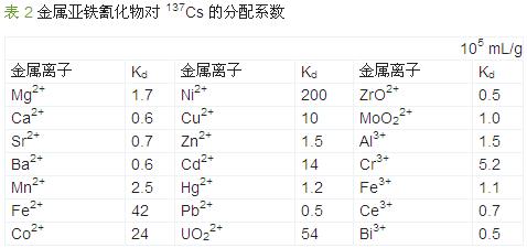 金屬亞鐵氰化物對銫的選擇性吸附能力強(qiáng) ,相關(guān)研究較多 。 Bing Li 等 〔19〕考察了亞鐵氰化鋅對低放廢水中 134Cs 的去除效果及相關(guān)影響因素。 研究結(jié)果表 明 ,pH 為 1 ~10、 134Cs 初 始 放 射 性 活 度 為 3.2 ~ 160.0 kBq/L 時(shí),投加 0.33 g/L 亞鐵氰化鋅即可去除 98%以上的 134Cs,60 min 內(nèi)達(dá)到吸附平衡,吸附量為 9.6~463.0 kBq/g。 當(dāng) 溫 度 為 0~50 ℃ 且Ca2+ 、Fe3+ 、 Mg2+、HCO3-、CO32-、Cl-、SO42- 存在時(shí) ,亞鐵氰化鋅對 134Cs 的去除效果不受影響 ,但當(dāng)溶液中含有 K+或 Na+時(shí),134Cs 去除率降低 。 Changping Zhang 等 〔20〕用亞鐵氰化鉀鋅去除模擬廢水中的銫。 靜態(tài)試驗(yàn)中 ,當(dāng)亞鐵氰化鉀鋅投加量為 0.33 g/L,Cs+質(zhì)量 濃 度 為 100 μg/L 時(shí) ,在 15 ℃下振蕩吸附 60 min 后 Cs+的去除率可達(dá) 98%以上,DF 為 76; 小試采用吸附-微濾工藝 ,持續(xù)曝氣使吸附劑與廢水充分混合,出水經(jīng)微濾膜過濾后用蠕動(dòng)泵抽出 。 試驗(yàn)處理水量 1320 L,濃縮產(chǎn)物體積為 2.28 L,出水中 Cs+的平均質(zhì)量濃度為 0.59 μg/L,平 均 DF 為 208,CF 為 539,具 有 毒 性 的 CN-質(zhì)量濃度 <2 μg/L。 V. V. Milyutin 等 〔21〕研究了不同 金 屬 的 亞 鐵 氰 化 物 共 沉 淀 微 量 銫 (105 Bq/L),當(dāng) Mn+與 Fe(CN)64-的物質(zhì)的量比為 1.33 時(shí) ,金屬亞鐵氰化物對 137Cs 的分配系數(shù)見表 2。