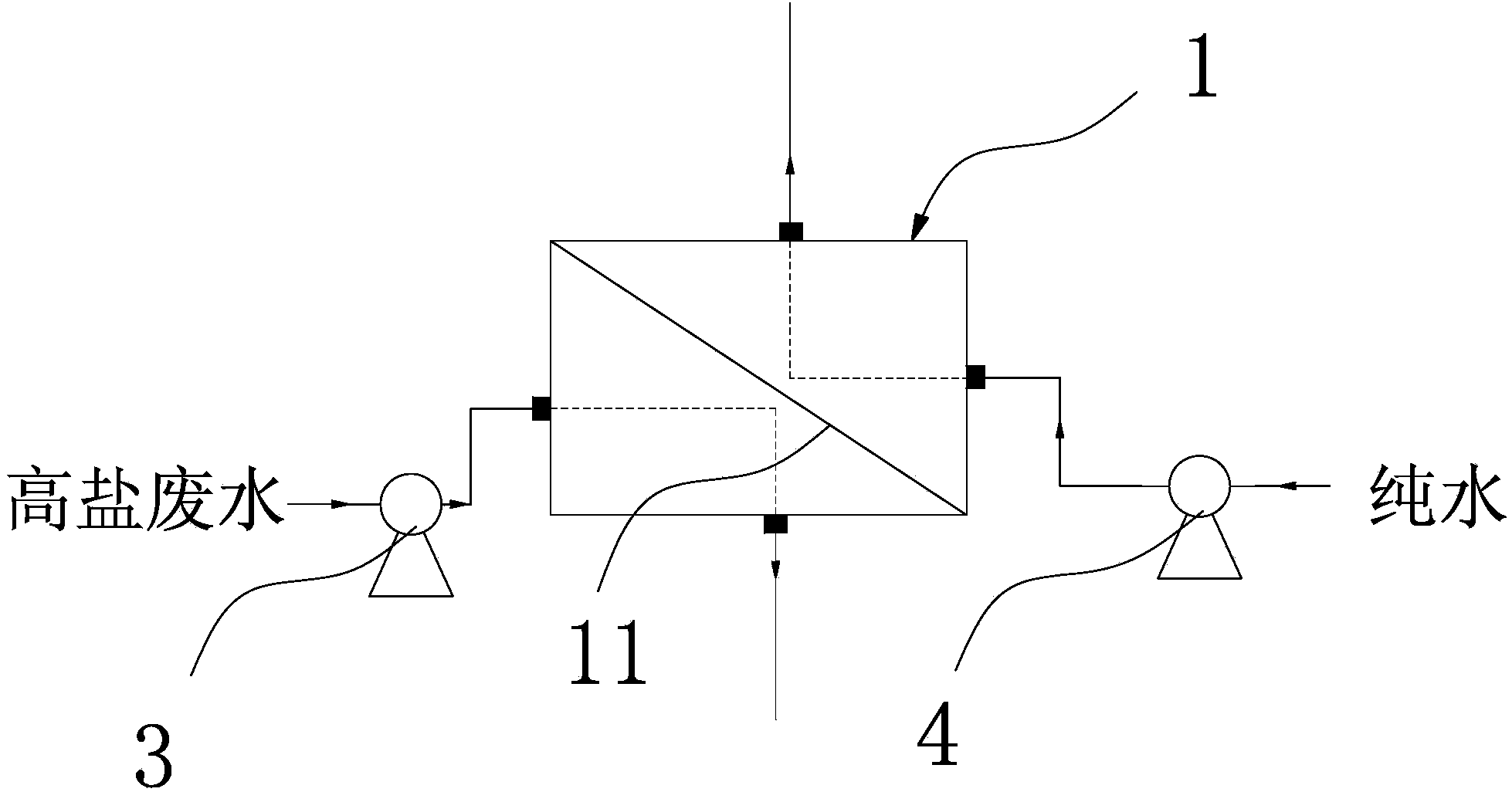 A、通過水泵一(3)將高鹽廢水輸送到納濾設(shè)備;通過水泵二(4)將純水輸送至納濾設(shè)備,再使高鹽廢水和純水分別從納濾設(shè)備中的納濾膜(21)兩側(cè)流經(jīng)納濾膜(21)進行納濾;所述納濾設(shè)備中的納濾膜(21)一側(cè)流經(jīng)高鹽廢水的為高鹽廢水側(cè);所述納濾設(shè)備中的納濾膜(21)另一側(cè)流經(jīng)純水的為純水側(cè);所述高鹽廢水從納濾設(shè)備中的高鹽廢水側(cè)流入和排出;所述純水從納濾設(shè)備中純水側(cè)流入和排出;