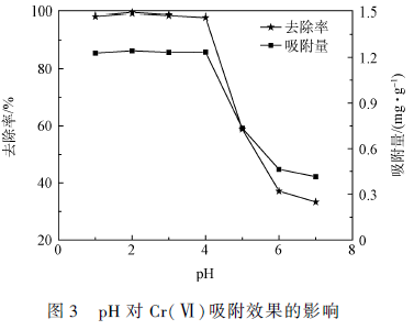 有研究表明,pH 值的大小會會影響吸附劑表面的活性基團的存在狀態(tài)和Cr(Ⅵ)在水中的化學形態(tài),因而對Cr(Ⅵ) 的去除效果影響很大。由圖3可知,當pH < 4. 0 時,新增加的N—H 基團與H3O +相結(jié)合,并與Cr(Ⅵ) 發(fā)生絡合作用,Cr(Ⅵ) 的去除效果較好,溶液中只存在HCrO4- 陰離子,與炭化核桃殼表面的活性基團更好地結(jié)合,故去除率較高,當逐漸增加pH 值時,溶液中Cr(Ⅵ) 存在形態(tài)較多,OH - 離子含量逐漸增加,反應體系中存在競爭吸附,故Cr(Ⅵ)的去除率與吸附量急劇下降,當pH = 2. 0時,去除率比較大為99. 1% ,滿足酸度較低時有利于吸附反應的進行。故選擇反應的pH 值為2. 0。
