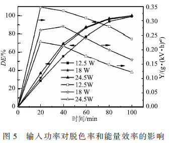 一方面,隨初始濃度的增加,MB降解產生的中間產物的濃度增加。MB與中間產物都和等離子體產生的活性物質反應,但在相同的輸入功率下活性物質的濃度為定值,因此在高濃度的MB溶液中,脫色率較低,但由于高濃度的MB溶液中MB分子的數量較多,有更多的機會與活性物質發生作用,因此高濃度的溶液的能量效率較高。另一方面,隨著溶液濃度的增加溶液的透光性變差,降低了紫外光對溶液的作用,也是導致脫色率下降的另一原因。MACUREANU等在用DBD反應器降解己酮可可堿(pentoxifylline)的研究中也得到了相似的結果。