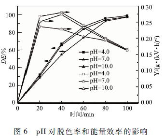 實驗采用初始濃度為50 mg/L、體積50 mL的MB溶液,空氣流量60 SCCM,上氣室高度7. 5 mm,下氣室高度7 mm,輸入電壓6 kV。改變初始pH分別為4.0,7.0和10. 0。在圖6中可以看出pH=4.0和pH = 10. 0時MB的脫色率和能量效率都較高,pH =4. 0的脫色率比較高。這是因為在本實驗中臭氧起到重要的降解作用,在酸性條件下臭氧的濃度較高主要發生臭氧的直接氧化反應,在堿性條件下主要發生通過輕基自由基(·OH)降解MB的間接氧化反應,而中性條件下,臭氧液相中的濃度較低。除此而外,pH會影響MB分子在水中的狀態,解離的濃度不同也會導致速率常數的差別。綜合以上因索,酸性和堿性條件下MB的降解率和能量效率都較高,pH為4. 0時降解效果比較好,選擇pH 4. 0為實驗條件。