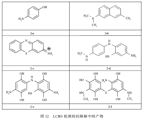 氧氣等離子體處理MB溶液15 min后,得到的溶液用GCMS和LCMS分析,檢測到的中間產物如圖11和12所示。根據已有研究和前面結果推斷,MB分子的降解主要通過3種途徑:高能電子攻擊、臭氧氧化和輕基化。