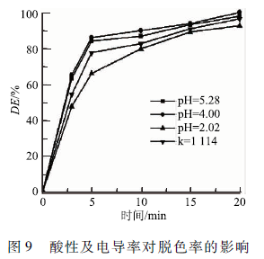 從2. 4的研究中可知酸性pH下MB的脫色率和能量效率都較高。為了進一步研究酸性的增加對MB降解的促進作用和NO的產生導致的反應中毒(含氧活性物質濃度的下降、電導率的升高)對MB的影響。在氧氣條件下,處理初始濃度為100 mg/L的MB溶液,分別調節MB溶液的pH為2. 02(空氣處理100 min時的pH為2. 07 ) 、4. 00和5. 28(不加硫酸的MB溶液的pH ),在pH為4. 00的溶液中加入硫酸鈉調節初始電導率(k)至1 114 μS / cm ,得到圖9。酸性增強對MB降解并不總是有利的,在pH從5. 28下降到4. 0時,MB的脫色率增加,但是當pH進一步下降到2. 02時,溶液的脫色率顯著下降。pH為5.28、4. 00和2. 02時溶液的電導率分別為64 、 150和4. 08 mS / cm 。強酸性條件不利于MB的降解,是由于電導率升高導致電場強度下降,等離子體隧道難于形成,活性物質濃度下降,從而導致的MB的脫色率在強酸性條件下較低。電導率升高導致的MB降解抑制效應,在加入硫酸鈉調節初始pH為4. 0的MB溶液的電導率k=1 114 μS / cm 降解MB溶液的實驗中,得到脫色率下降的結果中得到進一步的證實。因此,酸性的增強對MB降解的促進作用與酸性增強導致的電導率升高對MB降解的抑制作用相比較弱。因此,空氣曝氣時NOx的產生,導致的酸性效應并不能加強MB的降解,NOx的產生導致的反應中毒(氧化性物種中毒以及電導率升高等)是使MB的降解效率下降另一重要原因。