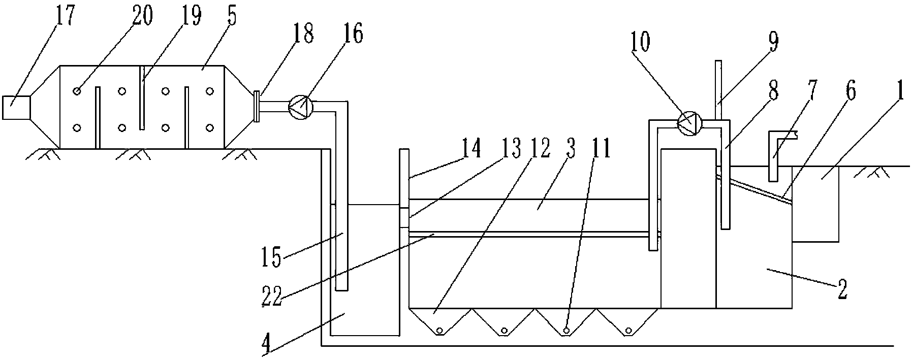 與現(xiàn)有技術相比,本發(fā)明的有益效果是:進入到過濾池內的污水經(jīng)過濾網(wǎng)的過濾之后,其中的砂石被截留下來,并進入到砂石池內儲放,方便人員集中對砂石進行處理,同時排泥支管均與排泥干管的設計,能方便的將沉降在污泥斗內的污泥排出,便于對沉淀池進行有效的清理,比較后污水經(jīng)過消毒箱的消毒之后可以直接達到排放標準,整體結構簡單,操作方便,基本無需人工進行干預。