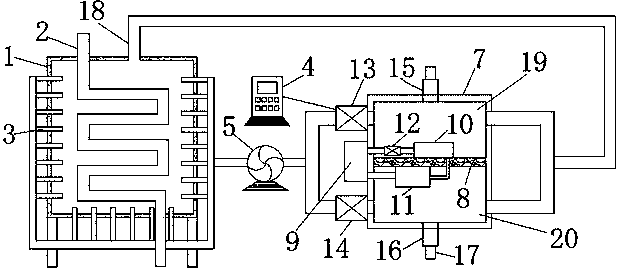 1.一種電極箔生產用水處理系統,包括保溫箱(1)、水管(2)、PLC控制器(4)、引風機(5)和冷熱制造箱(7),其特征在于:所述水管(2)穿過保溫箱(1),且在保溫箱(1)內部的水管(2)呈折疊狀設置,所述保溫箱(1)的側壁與底端均安裝有進氣支管(3),所述進氣支管(3)的進氣口通過管道與引風機(5)的出氣口連通,所述冷熱制造箱(7)內部安裝有隔熱板(8),所述隔熱板(8)的上端和下端分別為制冷腔(19)和制熱腔(20),所述隔熱板(8)的上端和下端分別安裝有蒸發器(10)和冷凝器(11),所述冷熱制造箱(7)的外壁安裝有壓縮機(9),所述壓縮機(9)通過管道分別與蒸發器(10)和冷凝器(11)連通,所述蒸發器(10)和冷凝器(11)通過毛細管連通,所述壓縮機(9)與蒸發器(10)之間的管道上安裝有電磁閥(12),所述制冷腔(19)和制熱腔(20)的出氣口通過分別均與引風機(5)的進氣口連通,所述制冷腔(19)和制熱腔(20)的出氣口處分別安裝有第二電磁閥(13)和第三電磁閥(14),所述制冷腔(19)和制熱腔(20)進氣口通過管道均與保溫箱(1)上端的出氣管(18)連通,所述引風機(5)、壓縮機(9)、電磁閥(12)、第二電磁閥(13)和第三電磁閥(14)均與PLC控制器(4)電性連接。