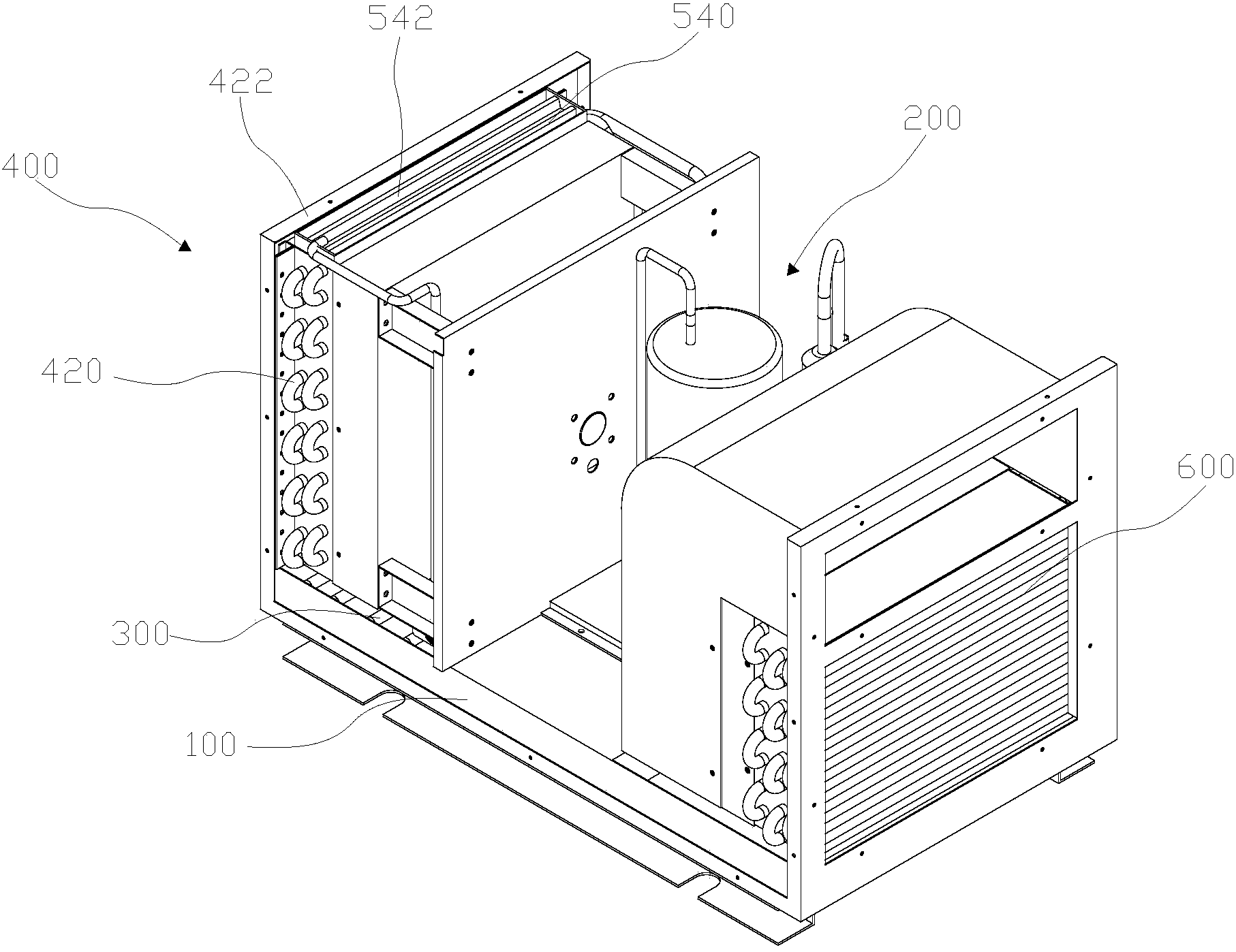 進(jìn)一步地,所述蒸發(fā)組件包括冷凝器,所述儲(chǔ)液槽的槽口寬度與所述冷凝器的寬度相匹配。