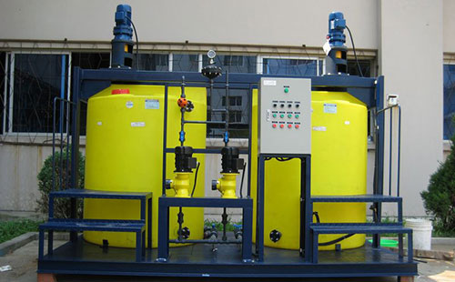 自動調配系統主要由三個槽體、三個溶藥攪拌機、預混合器等組成。給料系統螺桿將干粉投入預混合器進行充分混合,再注入溶液槽進行攪拌,這樣使得投入的干粉在槽體內不會產生結塊起團的現象,使得投入的干粉充分溶解到溶解槽中,不會造成浪費。溶藥攪拌機和不斷的在溶藥槽內攪拌機,使得干粉充分溶解,溶解好的藥液進入下一步環節熟化過程。進入熟化槽攪拌機不斷的進行攪拌熟化,經過熟化好的溶液進入第三槽儲液槽儲存,等待投加系統的使用。
