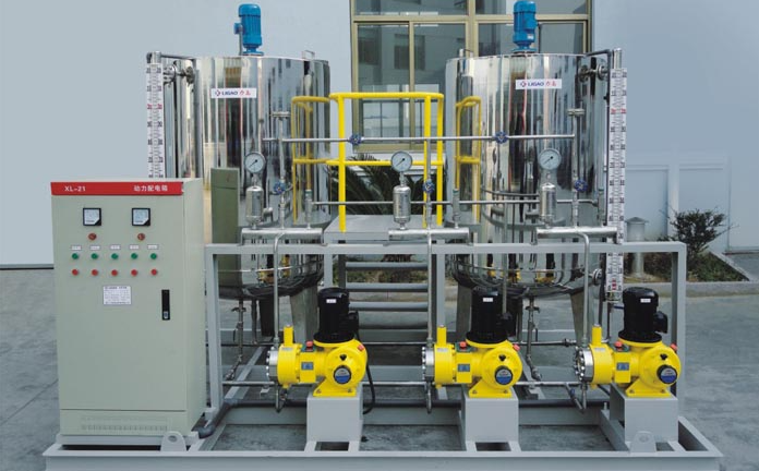本裝置主要包括藥液溶配系統、計量投加系統、安全系統和控制系統等四部分。