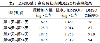 在正式期的第11天~第54天,持續(xù)的進(jìn)水DMSO高負(fù)荷對模試裝置的運(yùn)行形成沖擊,當(dāng)DMSO處于高負(fù)荷狀態(tài)時DMSO的去除效果見表3。